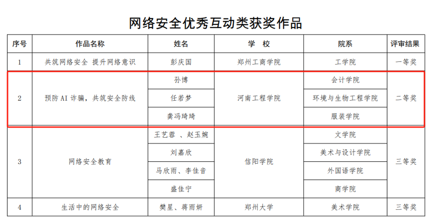 在网络安全优秀互动类作品中,pg官网孙博、任若梦、龚冯琦琦作品《预防AI诈骗,共筑安全防线》作品获二等奖。