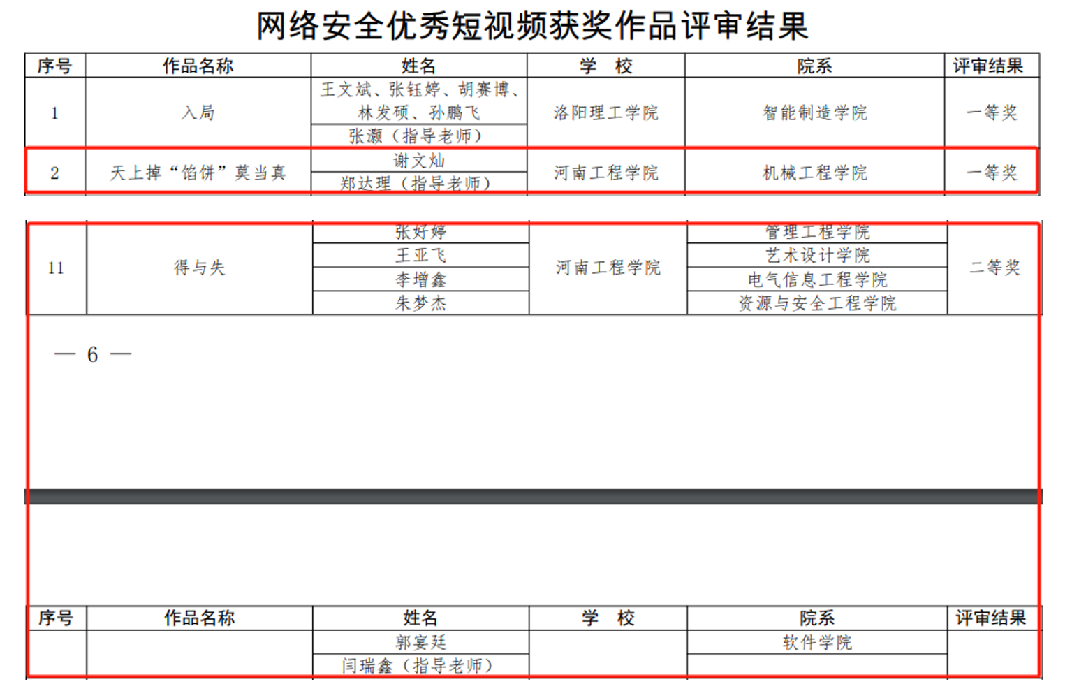 在网络安全优秀短视频评选中,由pg官网机械工程学院郑达理老师指导,谢文灿同学的作品《天上掉“馅饼”莫当真》获一等奖,由闫睿鑫老师指导,张好婷、王亚飞、李增鑫、朱梦杰、郭宴廷等同学的作品《得与失》获二等奖。