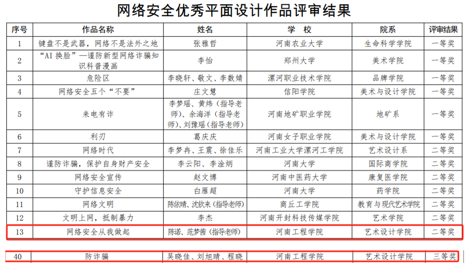 在网络安全优秀平面设计作品中,艺术设计学院陈诺、范梦茜老师的作品《网络安全从我做起》获二等奖,艺术设计学院吴晓佳、刘旭晴、程晓同学的作品《防诈骗》获三等奖。